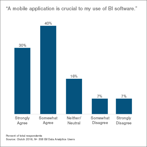 User emphasis on mobility has grown significantly in a short amount of time. Clutch’s 2016 BI survey found that only 41% of data analytics users even used a mobile phone or tablet to access their BI data—now almost double that number believe mobility is crucial to their use of the software.