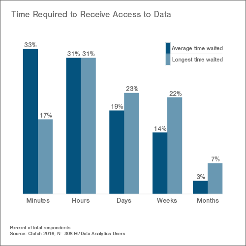Less than 20% of respondents say they typically only wait a few minutes to gain access to their data. In the business intelligence industry, a time delay of hours or more to access data can pose a problem for employees attempting to collaborate quickly and efficiently with colleagues.