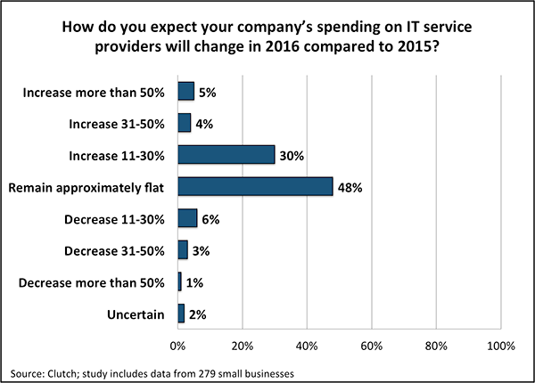 WASHINGTON DC, Jan 20, 2016 – Small businesses are less than satisfied with their IT service providers, according to a new study conducted by Clutch, a leading B2B research firm. Despite relatively poor ratings from SMBs, nearly 40% of surveyed firms say they plan to increase spending on IT services in 2016, further enhancing the opportunity for market leaders.
