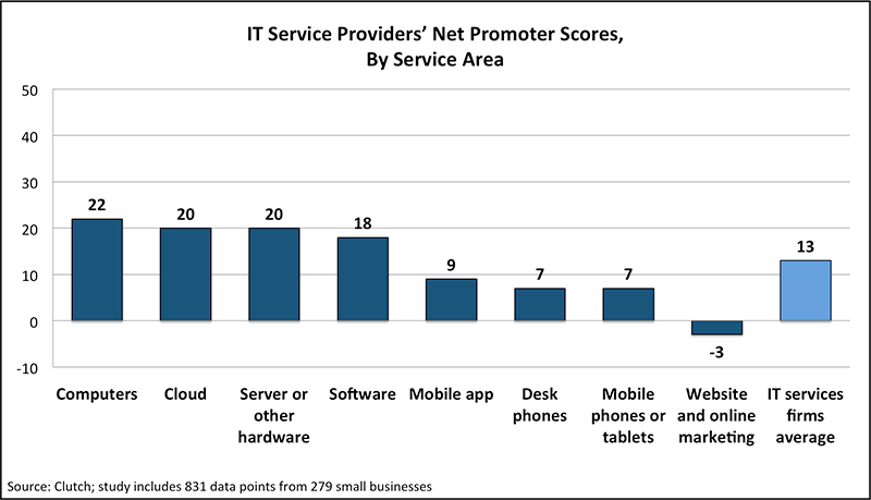 Clutch’s study, which includes ratings of 800+ IT services firms, found that the average Net Promoter Score (NPS) for SMBs’ IT service providers was 13, compared to B2B professional services firms’ benchmark scores of 30+. NPS is a standardized measure of client satisfaction. These scores indicate definite client service challenges for IT service providers compared to other types of service providers.